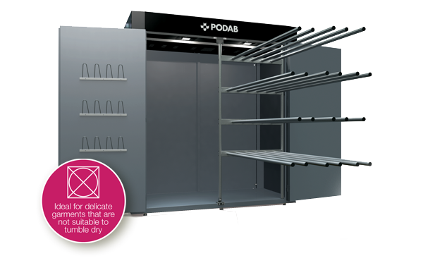 - Industriële droogkasten zijn zeer geschikt voor het drogen van delicate kledingstukken zoals kostuums, uniformen en pakken, omdat ze het risico op slijtage verminderen.